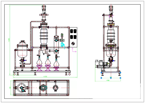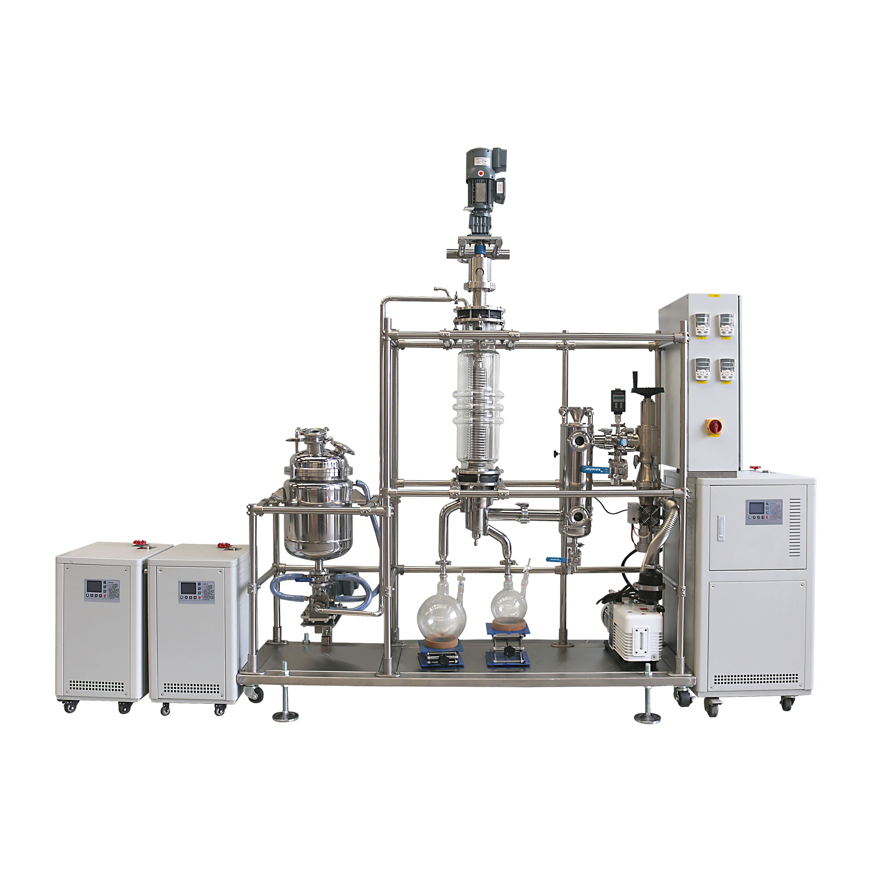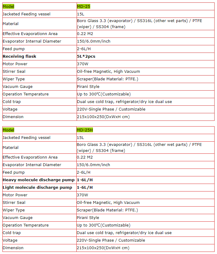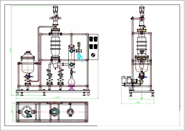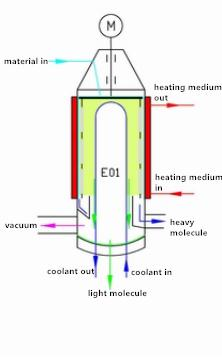 The separation process is as shown in the figure. The material is added from the top of the evaporator and distributed continuously and uniformly on the heating surface through the material-liquid distributor. The film scraper scrapes the product into a very thin, turbulent liquid film. In this process, the light molecules escaping from the heating surface reach the condenser and condense into liquid, and flow down the condenser tube, and discharge through the discharge tube at the bottom of the evaporator; Residues, or heavy molecules, are collected in a circular channel under the heating zone and then discharged through a side discharge tube.