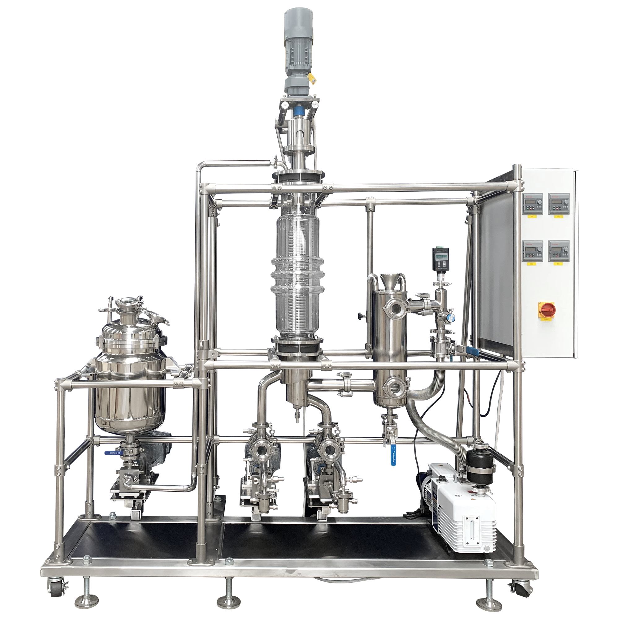 Topacelab also provide turnkey solution for jacketed reactors, we have heater, chiller, vacuum filter and vacuum pump. When working with heating / cooling circulators, the temperature inside the vessel can be gently and accurately controlled by thermal fluid circulation inside the jacket. This reaction vessel is rated to operate safely under full vacuum.